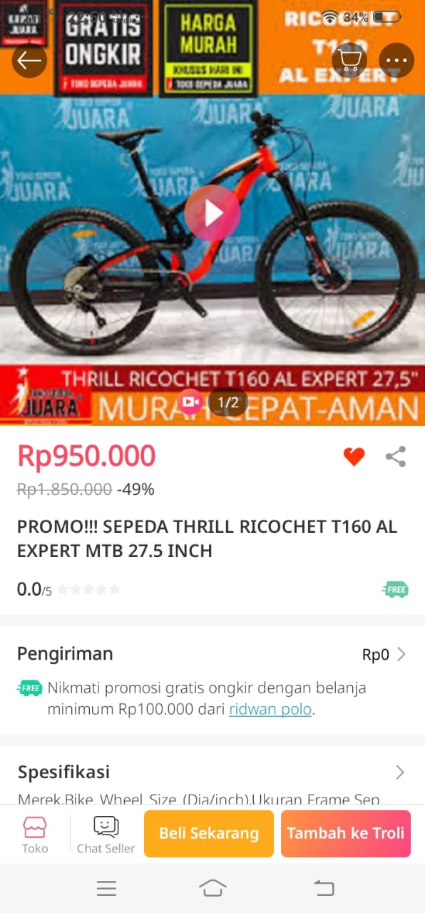Thrill Ricochet yang harga termurahnya 8 jutaan, dibandrol 900ribu aja. Dan udah free ongkir. WOW..Bagi yang awam atau baru memulai hobi bersepeda, jelas harga tersebut bikin mupeng, ngebet banget. Apalagi ada embel-embel “Gratis Ongkir”.